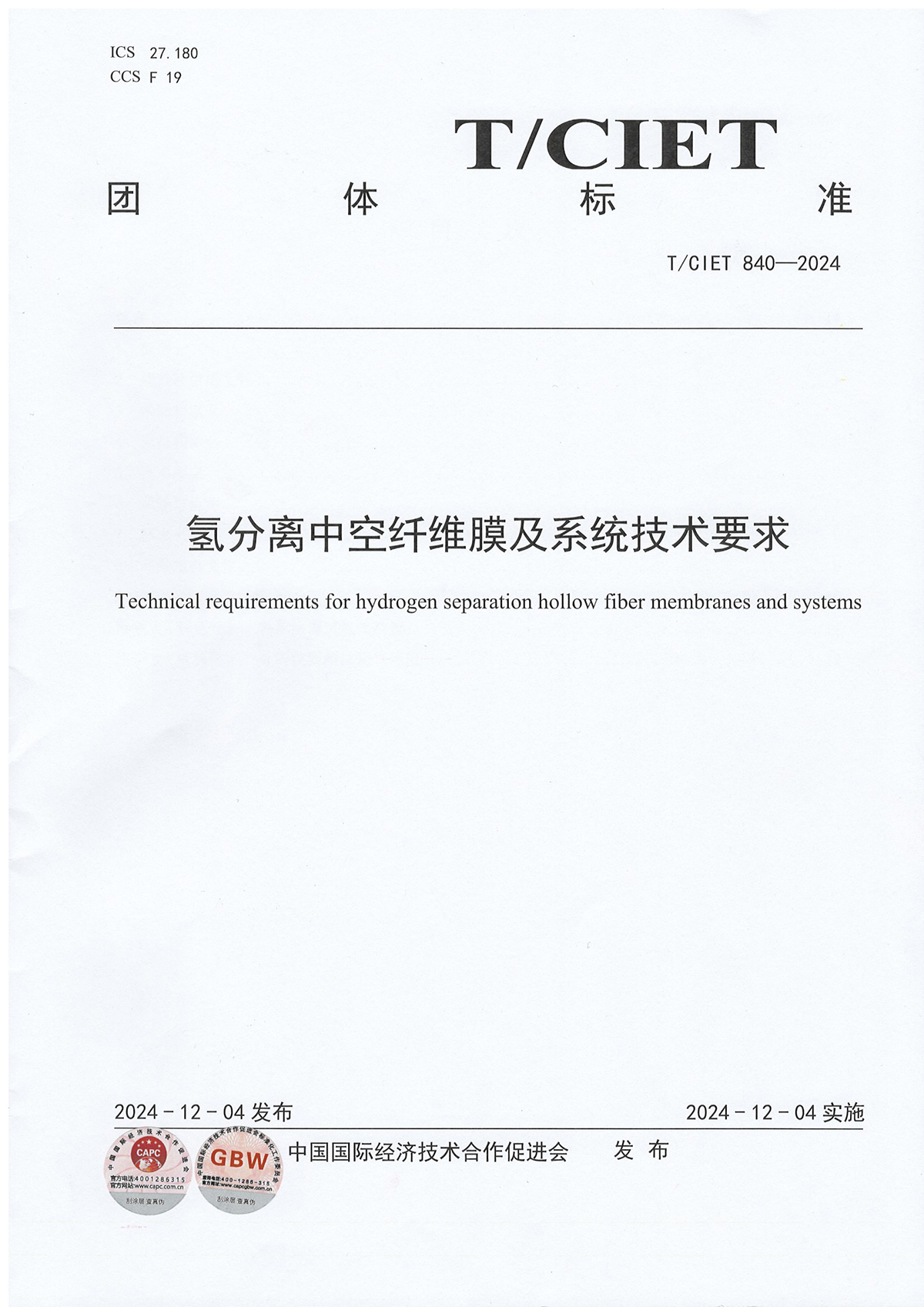 2024年12月4日,天邦公司與大連理工大學等共9家單位共同發布了《氫分離中空纖維膜及系統技術要求》團體標準。