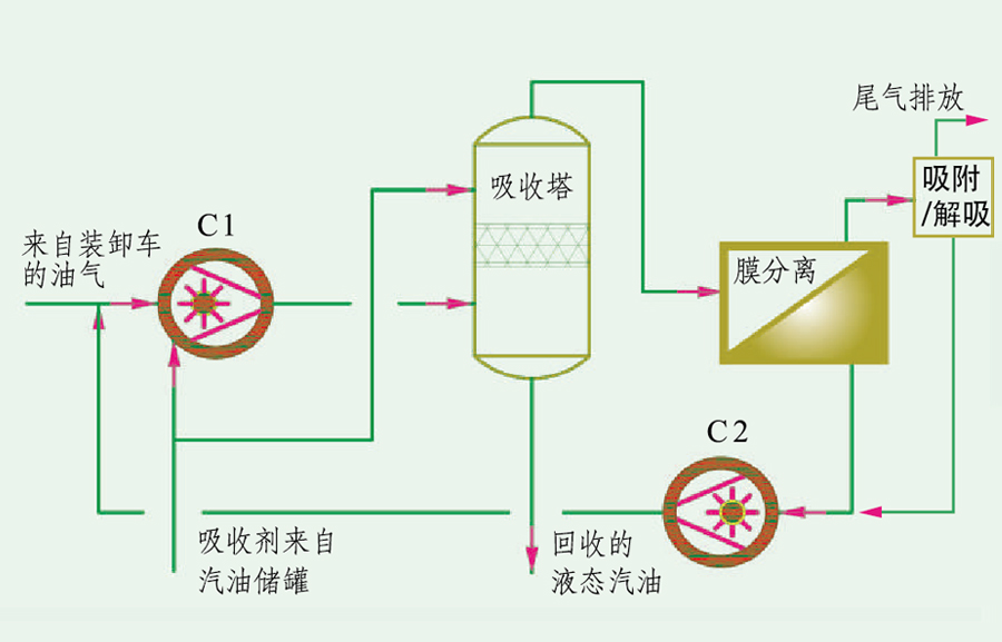 儲罐卸壓排放氣或汽車卸凈后的尾氣經緩沖罐后,進入壓縮/冷凝,然后通過氣液分離罐將液相產品分離出去。分液罐的不凝氣進入膜分離系統,滲透氣和真空解吸氣返回到壓縮機入口:膜分離系統的尾氣為提濃氮氣,非甲烷烴低于15q/㎡送至氮氣緩沖罐或進一步送吸附凈化<60mg/m,油氣總烴回收率大于97%。