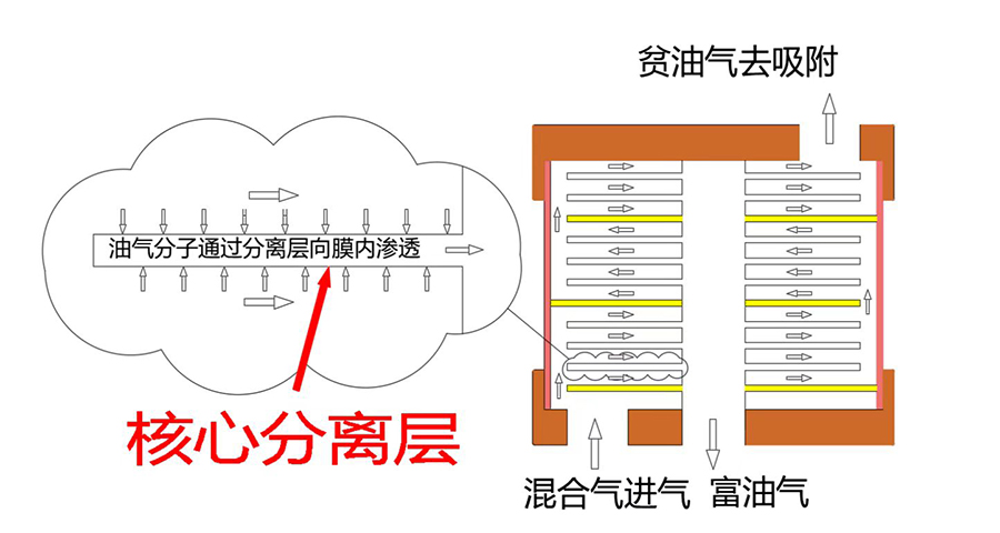 核心分離層采用硅橡膠復合膜技術(專利號:ZL 2015 1 0856947.7),硅橡膠功能層(膜分離器核心)與支撐基層結合成膜后具有超薄(裝填密度大)、牢固(壽命長)及無缺陷(分離性能高)的優點。在此基礎上制作加工的疊式膜分離器,應用在有機蒸汽(VOCs)分離過程中,能很好的滿足其處理量大、分離系數高以及氣體組分復雜工況下的長壽命工藝要求,目前是國內VOCs治理領域內不可替代的、唯一能替代進口的膜分離器產品。